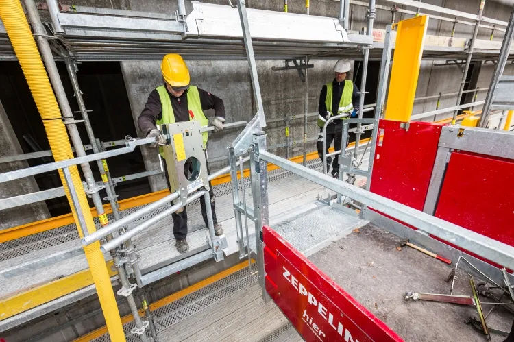 Derzeit ist die Hochbauphase in vollem Gange. Das neue Museum wird aus vier Geschossen und zwei Seitenflügeln bestehen und zur Havel hin offen sein. Um Personen und Baumaterialien sicher in die Höhe transportieren zu können, orderte das beauftragte Gerüstbauunternehmen, die Gerüstbau Scheffler GmbH mit Sitz im nahegelegenen Werder, Materialaufzüge von Zeppelin Rental.