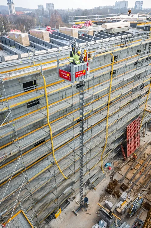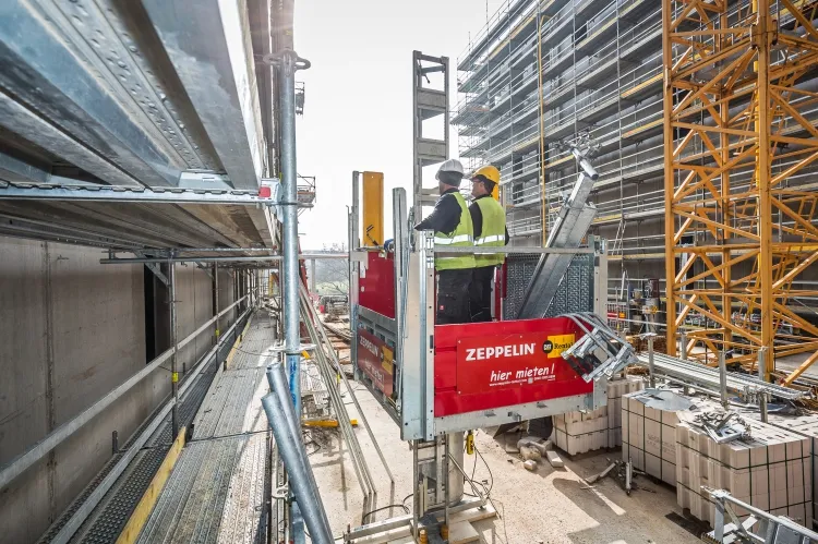 In und um Berlin ist bei Zeppelin Rental Detlef Biallas gemeinsam mit seinem Team für die Aufzugsvermietung verantwortlich. In einem ersten Schritt besichtigte er mit dem Kunden die Baustelle, um ein passgenaues Angebot abgeben zu können und die Gegebenheiten vor Ort in Bezug auf Anlieferung, Aufstellung und Betrieb zu prüfen. Die beiden einmastigen Transportbühnen 500 Z/ZP, die sowohl für die Beförderung von Lasten als auch von bis zu fünf Personen geeignet sind und eine Tragkraft von insgesamt 850 Kilogramm haben, wurden an der Innenfassade im Hof benötigt.