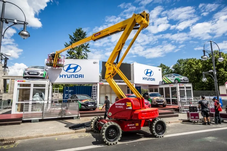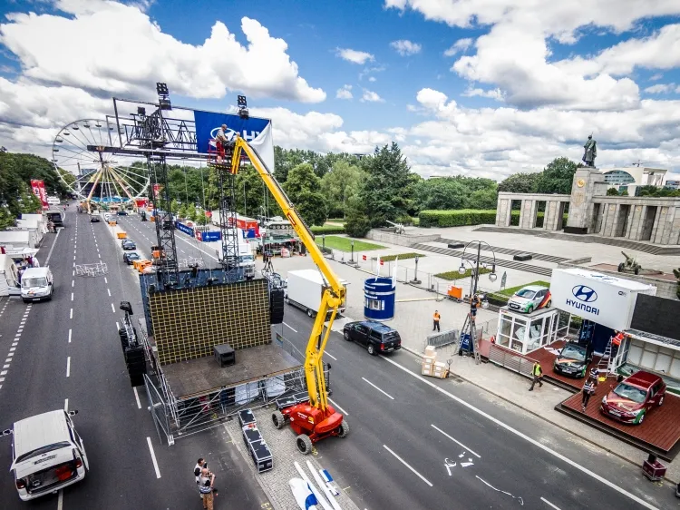 Das Kompetenz-Center für Arbeitsbühnen in Berlin stellte für Aufbauarbeiten insgesamt vier Personenarbeitsbühnen zur Miete bereit: zwei Hybridbühnen ZGT21.13HY, eine Teleskopbühne ZT22.17D sowie eine LKW-Bühne ZL28.20. So wurden Werbebanner und -platten aufgehängt, die so genannte Main Stage mit ihrer 60 Quadratmeter großen Leinwand aufgebaut, die Technik montiert und vieles mehr. Für die Veranstaltung selbst lieferte Zeppelin Rental eine Scherenbühne ZS15.23D an. Sie dient als Plattform für Pressefotografen.