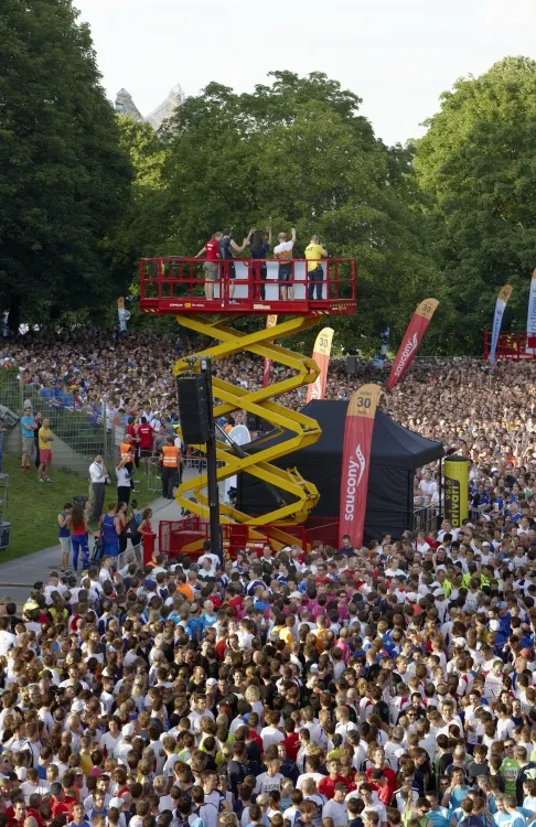 Während der Veranstalter der B2RUN-Laufserie die Flurförderzeuge hauptsächlich für Auf- und Abbauten benötigte, waren die Arbeitsbühnen während der Veranstaltungen gefragt. Bis zu vier Bühnen – meist ein bis drei Scherenbühnen und eine Teleskoparbeitsbühne – wurden eingesetzt. Sie dienten als Plattform für den Startschuss von oben oder ermöglichten Fotoaufnahmen aus der Höhe. Zusätzlich kümmerte sich Zeppelin Rental um den An- und Abtransport aller Mietgeräte und organisierte ihre nötige Dieselkraftstoff-Versorgung.