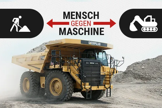 Sehen Sie die Leistung der Baumaschinen nun auch mit anderen Augen? Hätten Sie gedacht, dass ein Mensch über 20.000 Mal schaufeln muss, um den Muldenkipper CAT 777G zu beladen? Oder, dass bereits ein verhältnismäßig kleiner Minibagger deutlich effizienter arbeitet als der Mensch mit reiner Muskelkraft? Im Vergleich „Mensch gegen Maschine“ sind die Bagger deutlich als Sieger hervorgegangen. In der Praxis sind die Baumaschinen natürlich nicht als Wettbewerber zu sehen. Von kleinen Arbeiten wie dem Aushub eines Gartenteiches bis hin zum Einsatz auf der Großbaustelle gilt: Baumaschinen stellen eine effiziente Hilfe und Arbeitserleichterung dar. Und zur Bedienung eines Baggers braucht es dann wiederum ja immer noch einen Menschen.