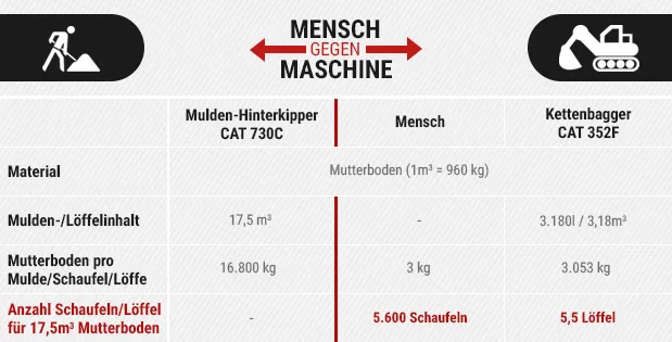 Das bedeutet, der Mulden-Hinterkipper CAT 730C kann pro gestrichener Mulde 16.800 kg Mutterboden transportieren. In der Praxis ist der Muldeninhalt meist gehäuft – zur besseren Vergleichbarkeit wurde in dieser Berechnung jedoch jeweils von einem gestrichenen Muldeninhalt beim Dumper sowie einem gestrichenen Löffel beim Bagger ausgegangen.Der Mensch kann pro Schaufel 3 kg Erde laden. Im nächsten Schritt wird berechnet, wie viele Schaufeln ein Mensch zum Beladen des Dumpers benötigen würde: 16.800 kg / 3 kg = 5.600 Schaufeln