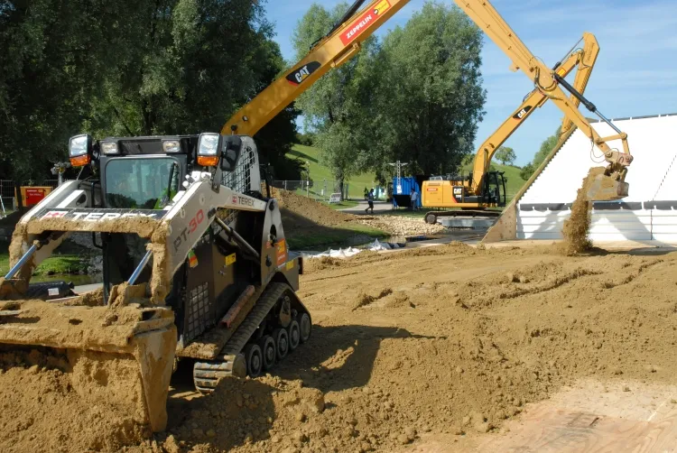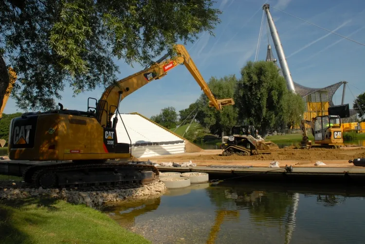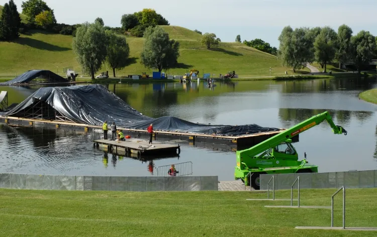 Um den Aufbau reibungslos abwickeln zu können, ist fast das gesamte Zeppelin-Rental-Produktspektrum im Einsatz. Flutlichtanlagen garantieren die nötige Helligkeit, Fahrzeuge die Mobilität auf dem weitläufigen Gelände. Mit Teleskop- und Gabelstaplern werden Gerüste, Podeste und mehr transportiert, zwei CAT 320 EL Ditch Clean schaufeln Erde auf Pontons im Olympiasee. Für einen Teil der temporären Infrastruktur sorgen unsere Raumsysteme.