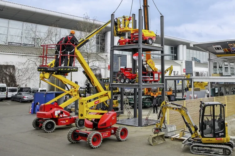 Die Mietstation München-Heimstetten von Zeppelin Rental um Leiter Markus Blenk und den stellvertretenden Leiter Bernhard Buchmaier stellte deshalb insgesamt 27 Arbeitsbühnen zur Verfügung. Zur Messe transportiert wurden 19 Scherenbühnen mit Arbeitshöhen von sechs bis 21 Metern sowie acht Gelenk-Teleskopbühnen. Ein Großteil der Gelenk-Teleskopbühnen verfügte über einen Hybrid-Antrieb, wodurch im Inneren der Messehalle ein emissionsfreier Batteriebetrieb, für anspruchsvollere Arbeiten im Freigelände der Betrieb mit Diesel ermöglicht wurde.