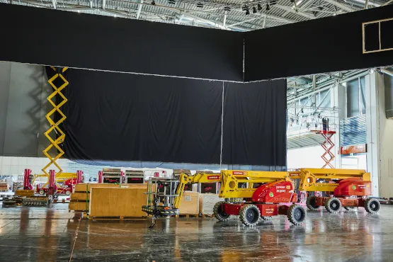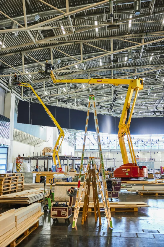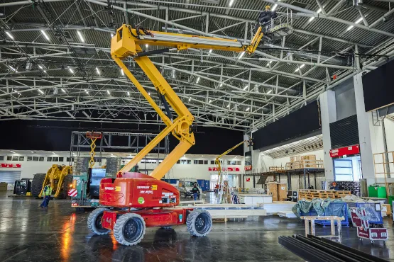 Gebaut wurde bis in eine Höhe von 14 Metern, wodurch der Einsatz von Höhenzugangstechnik unabdingbar wurde. Sieben Gelenkteleskop- und 13 Scherenbühnen waren im Einsatz: „Da die Arbeiten im Innenbereich stattfanden, haben wir ausnahmslos elektrische und hybride Modelle zur Verfügung gestellt. So war es möglich, komplett emissionsfrei zu arbeiten“, sagt Bernhard Buchmaier, stellvertretender Mietstationsleiter bei Zeppelin Rental in Heimstetten. Mit dabei: die Gelenkteleskopbühne ZGT 28.19HY von Hersteller Niftylift, die zum nachhaltigen ecoRent-Mietprogramm gehört. Diese ist als leichteste Bühne ihrer Klasse besonders wendig und überzeugt mit einer Arbeitshöhe von 28 Metern und nicht markierenden Reifen, die auch auf empfindlichen Hallenböden eingesetzt werden können. So konnten unter anderem drei Kilometer Traversen an der Hallendecke installiert werden, um dort anschließend Licht- und Tontechnik einzurichten. „Prinzipiell kommen die Geräte immer ab einer Arbeitshöhe von drei Metern zum Einsatz. Dazu gehören fast sämtliche bauliche Maßnahmen wie der zweistöckige Gastronomiebereich oder die Gestaltung der Wände“, erklärt Michael Kapper.