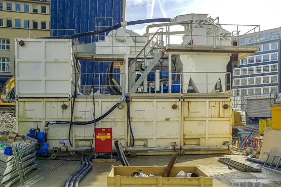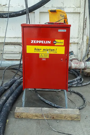 „Für die Spannungsversorgung der von TREVI genutzten Verbraucher haben wir insgesamt 20 Stromverteilerschränke auf dem Baufeld installiert und fast zwei Kilometer Kabel verlegt“, so Günter Schotsch. Dabei stehen nicht alle Stromverteiler einfach nur auf dem Boden. Im Bereich der so genannten Entsandungsanlage, in der TREVI die für die Herstellung der Schlitzwand nötige Stützflüssigkeit Bentonit wiederaufbereitet, schweißten die Monteure Halterungen an die angrenzenden Containerwände und hängten die Verteiler daran auf. Auf diese Weise bleiben sie sauber und werden von Sand und Stützflüssigkeit nicht in Mitleidenschaft gezogen. Neben der Entsandungsanlage benötigt TREVI den Baustrom unter anderem auch für seine Containeranlage und den Betrieb von Kleingeräten in der eigens auf dem Baufeld installierten Werkstatt.