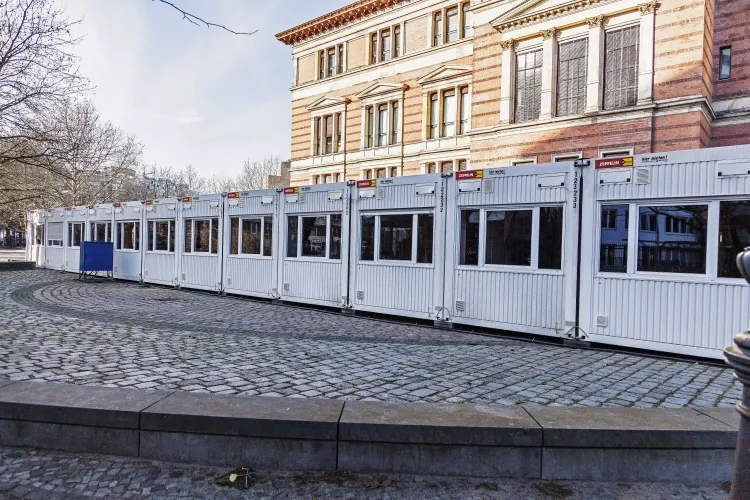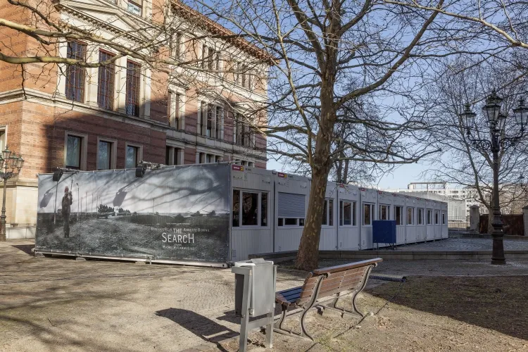 Im Anschluss an die Planung erfolgte die bauliche Umsetzung der Containeranlage. In einem ersten Schritt war die Vorbereitung der Raummodule in der hauseigenen Fertigungshalle vonnöten. Unter anderem mussten Seiten der Wechselwandcontainer versetzt und Doppelflügeltüren aus Glas eingebaut werden. Danach ging es an den Transport der Module an ihren Einsatzort, zum Martin-Gropius-Bau.