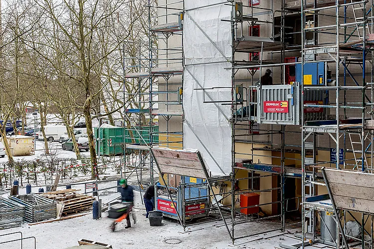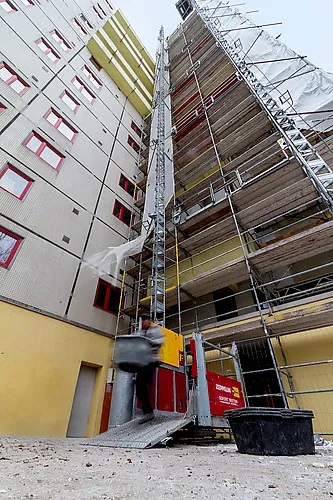 Die Aufzüge im Märkischen Viertel – bis jetzt waren rund 30 Geräte aus dem Mietpark von Zeppelin Rental im Einsatz – sind überwiegend bis zu einer Förderhöhe von 30 bis 45 Metern montiert. Auf Wunsch ist eine Auf- beziehungsweise Abstockung aber jederzeit möglich. Genutzt werden die Aufzüge von allen beschäftigten Gewerken zum schnellen und sicheren Transport von Materialien, Gerätschaften und Personal. So gelangen je nach Brandschutzbestimmung des entsprechenden Hochhauses die Polystyrol-Hartschaum- oder Mineralfaserplatten für das neue Wärmedämmverbundsystem, die neu einzubauenden zweifach verglasten Isolierglaskunststofffenster oder die ausgebauten Strangleitungen der Heizung, die durch eine energieeffiziente Zweirohranlage ersetzt wird, an ihren Bestimmungsort.