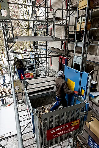 Im Märkischen Viertel mieten deshalb regelmäßig verschiedene Kunden – meist Fassaden- und Gerüstbauunternehmen – überwiegend Transportbühnen für Personen und Material mit einer maximalen Tragfähigkeit von 850 Kilogramm, die Zeppelin Rental schlüsselfertig zur Verfügung stellt. Nach einer sorgfältigen Prüfung der örtlichen Gegebenheiten und anschließender entsprechender Herrichtung des Aufstellplatzes kümmern sich die Monteure um Anlieferung und Aufbau der Transportbühne. Vor Übergabe erhält das Bedienpersonal eine genaue Einweisung in Betrieb und Bedienung der Aufzugsanlage.