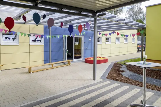 Im Inneren der Modulgebäude profitieren Kinder und Betreuer ebenfalls von höchsten Qualitätsstandards. So wurden in den Gruppenräumen bodentiefe Fenster eingesetzt, durch die viel Licht ins Innere gelangt. Sonnenschutz bieten außenliegende elektrische Jalousien und Markisen beziehungsweise Terrassenüberdachungen. Ein schwimmender Zementestrich sorgt für ein angenehmes Raumempfinden. Als Bodenbelag verwendete Zeppelin Rental Linoleum, in den Sanitärräumen Fliesen.