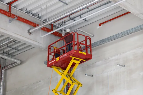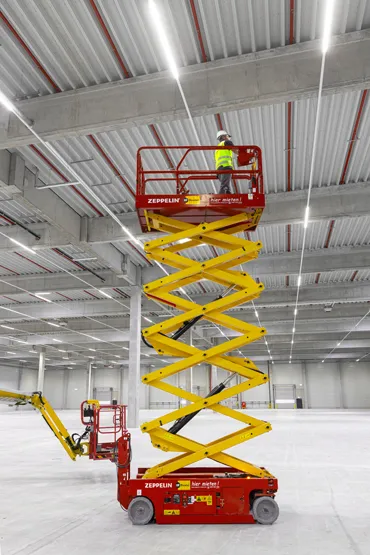 „Unser Kunde, die Schlau Elektrotechnik GmbH, hat in Spitzenzeiten 15 Arbeitsbühnen für die Elektroinstallation von uns gemietet“, so Andreas Ernst von Zeppelin Rental. Für die Montage der Leuchten an den Außenfassaden benötigte das Unternehmen zunächst geländegängige dieselbetriebene Arbeitsbühnen. Um sie auch für die Elektro-Rohinstallationen im Halleninneren, die noch vor der Betonage der Bodenplatte erfolgten, einsetzen zu können, stattete Zeppelin Rental sie mit Rußpartikelfiltern aus. Die flexiblen Partikelminderungssysteme können als so genannte Rucksacklösung schnell aufgebaut werden und sorgen für eine Reduzierung der Partikelemissionen.