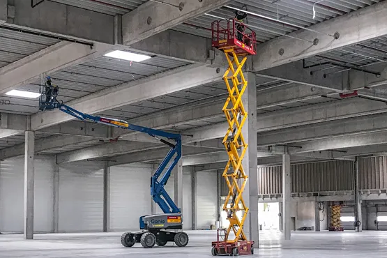Nach dem Abschluss der Boden-Betonierung führte Schlau Elektrotechnik die Arbeiten im Innenbereich der Lagerhallen mit elektrisch betriebenen oder Scheren- und Gelenk-Teleskopbühnen mit Hybridtechnik durch. „Mit Hilfe der Höhenzugangstechnik haben wir Rinnen und die LED-Beleuchtung an den 12,40 Meter hohen Hallendecken und an den Wänden montiert“, so Projektleiter Werner Gadzinski von Schlau. Außerdem wurden vor Ort Steckdosen und Maschinenanschlüsse installiert.