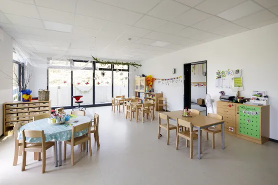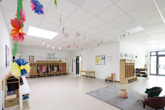 Als besonderes Highlight gilt der großzügige Spielflur, der unterschiedlichen Nutzungen wie beispielsweise Besprechungsecken und Garderobe Raum bietet. Zahlreiche Lichtkuppeln im Dach sorgen für viel Tageslicht und eine helle, freundliche Atmosphäre. Besonders praktisch: Dank der eingebauten Falttrennwand kann der Multifunktionsraum für Spiel und Bewegung individuell an die Aktivitäten angepasst und sogar um den angrenzenden Flur erweitert werden. Die verbauten Materialien wurden allesamt sorgfältig speziell für die Kitanutzung ausgewählt. Für einen besseren Überblick für die Erzieherinnen und Erzieher sorgen Glasausschnitte in den Innentüren, die einen Einblick in die Gruppenräume gewähren. Alle Innentüren sind gleichzeitig Schallschutztüren und sämtliche Räume sind mit Akustikdecken ausgestattet. Auch der Außenschall war bei der Kita Florianweg Thema: Aufgrund der unmittelbaren Nachbarschaft zur örtlichen Feuerwehr, des THW und der angrenzenden Bahnlinie erfüllt der Kita-Neubau höchste Schallschutzanforderungen.