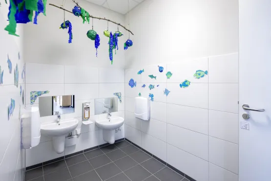„Die Herausforderung lag darin, den geforderten Grundriss einzuhalten. Wir haben uns hier an der Entwurfsplanung des Architekturbüros Mescherowsky orientiert und diese adäquat umgesetzt. Auf 692 Quadratmetern finden die kleinen Benutzer jetzt eine genau auf ihre Bedürfnisse abgestimmte Umgebung wieder“, freut sich Alexandra Altmeyer, Projektleiterin Raumsysteme bei Zeppelin Rental.