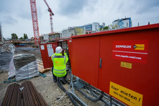 Ausreichend Power auf dem Baufeld garantieren 140 Stromverteiler und kilometerlange Stromkabel. „Die Größe des Baufelds und der hohe Strombedarf für die Maschinen und Geräte sind anspruchsvoll“, sagt Martin Bohmann, technischer Projektleiter für Energie, Klima und Wasser (EKW) bei Zeppelin Rental. Im Einsatz sind fast alle Stromverteiler-Größen – vom kleinsten Endverteiler, über Gruppen- und Hauptverteiler bis hin zu Containerverteilern für die modularen Raumlösungen. Zeppelin Rental verantwortet die Planung und den sukzessiven Aufbau der Elektro-Baustelleneinrichtung auf dem neuen Campus.