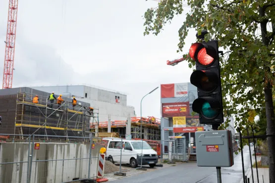 Vor dem Neubau wurden verschiedene Gebäude, die Teil eines Infrastruktur- und Technikkomplexes sowie der Studios waren, abgerissen. Bereits in dieser frühen Bauphase war Zeppelin Rental vor Ort und übernahm unter anderem die Baustellen- und Verkehrssicherung. „Wir zählten zu den ersten Unternehmen auf der Baustelle und konnten von Beginn an dafür sorgen, dass alles reibungslos verläuft“, betont Erol Ulusan, der verantwortliche Projektleiter aus dem Bereich LC&M von Zeppelin Rental. Da sich das Baufeld in einem vollständig erschlossenen Gewerbegebiet befindet, wird ein besonderes Augenmerk auf die Planung und Sicherheit gelegt. Denn die Mitarbeitenden in den angrenzenden Büro- und Produktionsgebäuden des Bauherrn sowie in den benachbarten Unternehmen sollen ihr Tagesgeschäft weiterhin uneingeschränkt durchführen können. Um dies sicherzustellen, erarbeitete Zeppelin Rental gemeinsam mit der Kommune ein Verkehrskonzept. Das Areal ist mit Bauzaun und Absperrgittern abgesichert. Zeppelin Rental stellte zudem Verkehrszeichen wie Parkverbotsschilder auf, sicherte den Fußgängerweg ab und errichtete Lichtsignalanlagen. Außerdem wurden Baustelleneinrichtungsflächen ausgewiesen und Fahrspuren nach Absprache mit den Behörden verlegt.