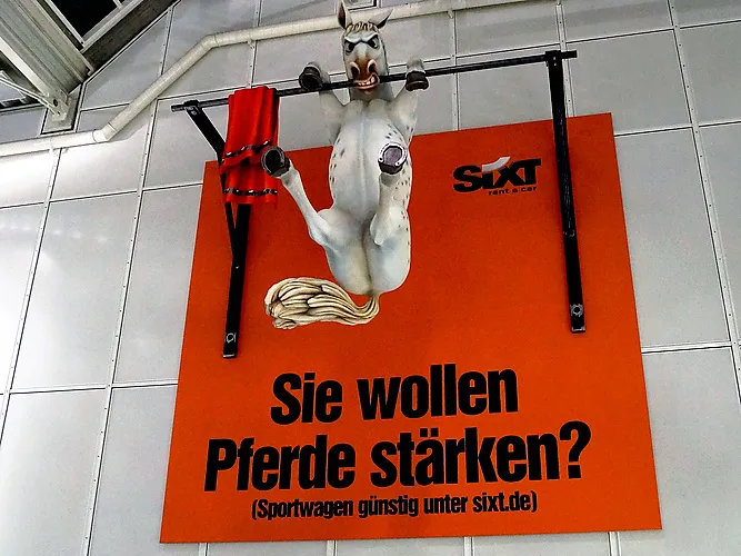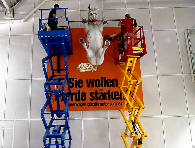 Um das Tier in der Abflughalle anschließend fachmännisch an die Wand zu montieren, wurde kurzfristig und spontan neben dem Eigentumsgerät des Münchner Flughafens eine zweite Scherenbühne benötigt. Hier half das Kompetenz-Center Arbeitsbühnen in München-Heimstetten mit einer ZS8.08A. Dank ihrer maximalen Arbeitshöhe von etwa acht Metern, ihrem elektrischen Antrieb und ihren schmalen Abmessungen eignete sie sich optimal für diesen Einsatz. So waren die Monteure auf den Arbeitsbühnen in der Lage, die beiden Enden der Klimmstange samt Pferd gleichzeitig an der Wand zu befestigen.