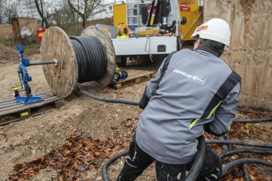 Zeppelin Rental stellt dabei nicht nur Expertise und Equipment, sondern darüber hinaus umfangreiche Serviceleistungen. Auch nach der Montage sind die Elektriker regelmäßig auf der Baustelle vor Ort, prüfen die Baustromanlage und führen je nach Bauphase nötige Anpassungen durch. Denn nur eine fachgerecht eingerichtete und betreute Elektro-Baustelleneinrichtung gewährleistet einen reibungslosen Bauablauf und die Sicherheit des Personals auf der Baustelle. Eine Baustrom-Infrastruktur dieser Größe ist ständig in Bewegung und erfordert gleichermaßen ein hohes Maß an Vorplanung sowie Flexibilität. Durch die intensive Zusammenarbeit und gemeinsame Vorbereitung mit GP Con stellt Zeppelin Rental sicher, dass sich in jeder Bauphase nur so viel Equipment vor Ort befindet, wie auch benötigt wird. Sobald die Infrastruktur steht, kann der Strom auf der Baustelle fließen. Den bezieht GP Con zu 100 Prozent aus regenerativen Energien.