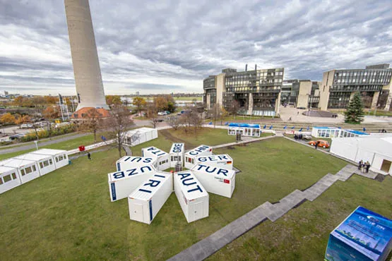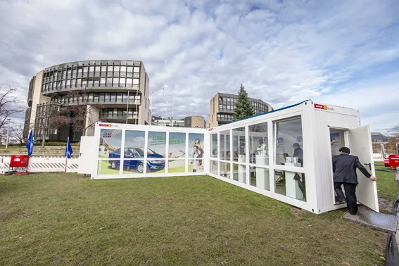 Die Raumsysteme wurden hauptsächlich als Ausstellungsräume genutzt. Zeppelin Rental versah sie daher zu großen Teilen mit verglasten Fronten, um für genügend Lichteinfall und eine repräsentative Optik zu sorgen. Da die Seitenwände der Container herausnehmbar sind, entstanden Räumlichkeiten unterschiedlicher Größen. Die Montage der Raumsysteme nahm lediglich vier Tage in Anspruch. Unter den Modulen waren auch Sanitärcontainer.