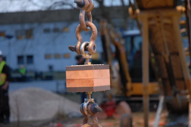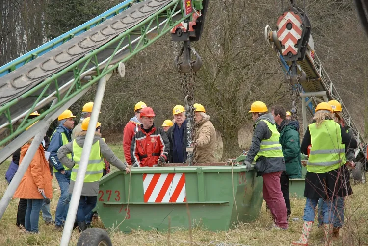 Nachdem das Eischnee-Zucker-Gemisch in einem Vorversuch am schlechtesten haftete, schied es aus. Im Anschluss ging es für den Reis-Glycerin- und den Quark-Kalk-Kleber ums Ganze: Die von Zeppelin Rental bereitgestellten Schuttcontainer wurden lediglich mittels der mit den Klebern bestrichenen Holzklötzen an Autokränen befestigt und angehoben. Danach hieß es für die Servicetechniker Metodi Ivanov und Klaus-Peter Franzen: Baggern, was das Zeug hält! Sie luden Kies auf die Förderbänder und befüllten so die beiden Container mit dem Schüttgut.