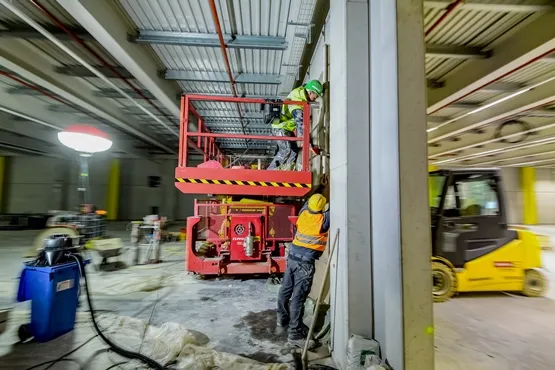 Scherenbühne und Elektrostapler agieren beim Bau des Logistikzentrums als sauberes Duo: In die aus Betonfertigteilen entstandenen Wände müssen abschnittsweise diverse Öffnungen gesägt werden, weil das Sicherheitskonzept dort beispielsweise ein Brandschutztor vorsieht. Von der Scherenbühne aus treiben Bauarbeiter dazu mithilfe eines Kernbohrgeräts zunächst je zwei Löcher pro Abschnitt in die Wand.