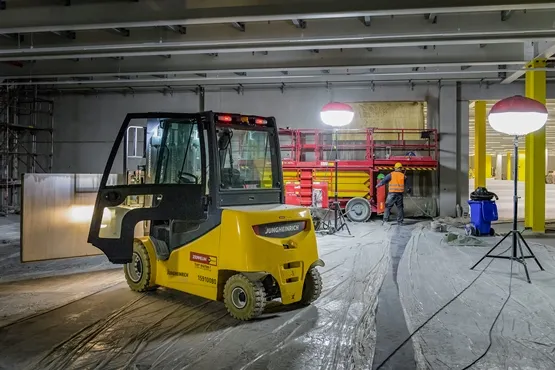 Für den Einsatz im Logistikzentrum mietet VGP eine Scherenbühne ZS 147.229D, die aufgrund ihres Allradantriebs auch auf dem teils unwegsamen Untergrund der Anlage mit optimaler Traktion punktet, sowie drei Teleskopstapler mit werkseitig integrierten beziehungsweise aufgebauten Dieselpartikelfiltern von Zeppelin Rental. „Mit den verwendeten Filtern erreichen wir eine Abscheiderate von über 97 Prozent aller Rußpartikel“, erklärt Vertriebsrepräsentant Christopher Schlögl, der die Baustelle betreut. Außerdem kommen fünf Elektrostapler EFG 550s von Zeppelin Rental zum Einsatz, die völlig emissionsfrei arbeiten.