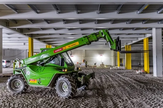 Um die Arbeiten in der Ausbauphase voranzutreiben, mietet die VGP Industriebau GmbH, eine Tochtergesellschaft der VGP Gruppe, die passenden Baumaschinen und -geräte für den Einsatz in den Innenräumen der Anlage bei Zeppelin Rental. Selbst dieselbetriebene Geräte, die die strengsten Emissionsvorschriften erfüllen, stoßen gesundheitsschädliche Rußpartikel aus. Das heißt jedoch nicht, dass in geschlossenen Arbeitsbereichen gänzlich auf Dieselmaschinen und ihre Vorteile wie beispielsweise eine hohe Umschlagleistung und die Unabhängigkeit von Stromquellen verzichtet werden muss. Nachgeschaltete Partikelfilter halten den Ruß aus den Dieselabgasen fast vollständig zurück und machen die Maschinen damit hallentauglich.