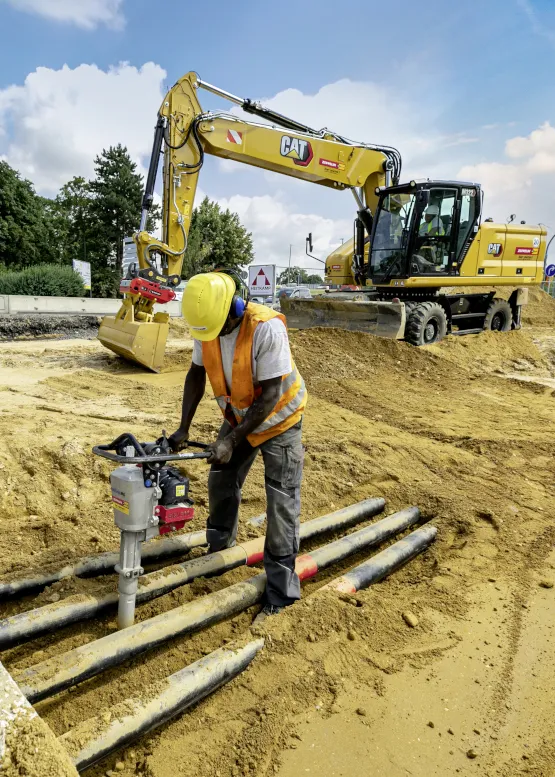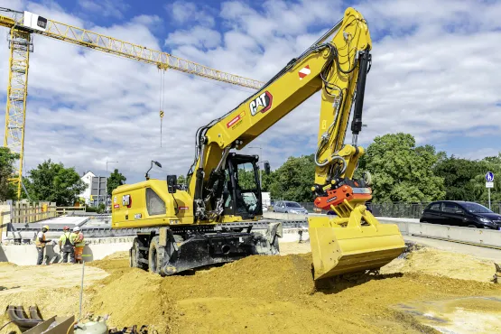 Unterstützung kommt von Zeppelin Rental: „Bei Brückenbauprojekten kommt ein Großteil unseres Leistungsportfolios zum Einsatz. Von Kleingeräten über Raumsysteme bis hin zu Baggern verschiedener Gewichtsklassen“, so Thomas Gräb, Key Account Manager bei Zeppelin Rental. Neben diversen Minibaggern waren auch ein Kettenbagger CAT 336FLN und ein Mobilbagger CAT M 322 im Einsatz. Beide Modelle erfüllen die aktuell gültige EU-Abgasstufe V und tragen das ecoRent-Siegel, welches besonders nachhaltige Mietlösungen kennzeichnet. „Dank einer Varianz an Anbaugeräten sind sie zudem universell einsetzbar“, weiß Thomas Gräb. Mittels Schnellwechselsystem war es dem Kunden möglich, unkompliziert zwischen Grabenraumlöffel, Hydraulikhammer, Greifer und Tieflöffel zu wählen.