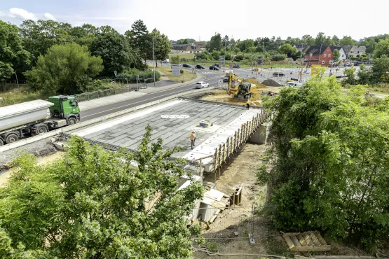 Doch nicht nur die eingesetzten Baumaschinen, sondern auch die Bauweise ist nachhaltig: „Im Gegensatz zu herkömmlichen Bauweisen verwenden wir weniger Beton und sparen so fast 70 Prozent CO2 ein. Klassische Betonbauteile – wie beispielsweise das Widerlager – werden fast vollständig durch Erdbauwerke mit stabilisierenden Geogittern ersetzt, die wir neben der Fahrbahn und somit ohne Verkehrsstörungen realisieren“, sagt Thorsten