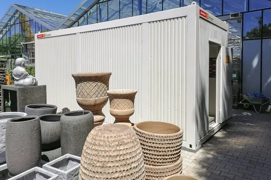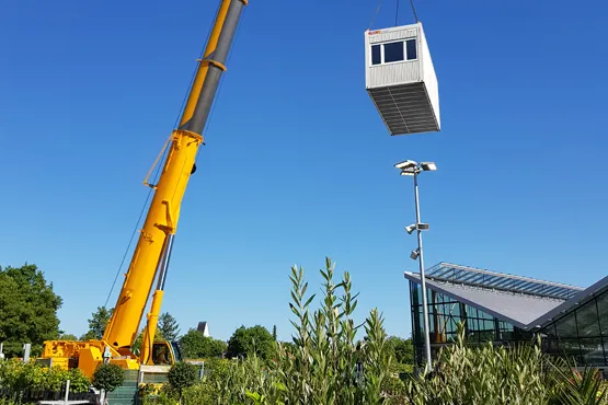 Ruhig und koordiniert hebt der Autokran einen Container nach dem anderem über das Dach des Dehner Garten-Centers in München-Trudering. Seit 7 Uhr morgens bereitet Zeppelin Rental die Anlieferung, Aufstellung und Montage von neun temporären Raummodulen im Innenhof des Gartenmarkts vor. Um 13 Uhr sollen die Arbeiten erledigt sein. „Ein sehr zügiges und besonderes Unterfangen“, so Lothar Meschkotat, Leiter Kompetenz-Center für Raum- und Sanitärsysteme in München und Deggendorf bei Zeppelin Rental.