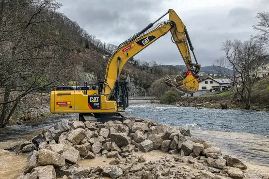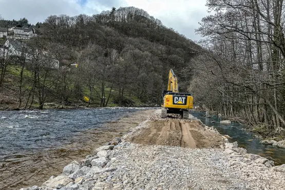 Der CAT 336 F verrichtete während der gesamten Bauzeit gute Dienste. So wurden seine große Tragkraft und seine maximale Auslegerlänge benötigt, um zwei Tonnen schwere Steine als Strömungsablenker sowie große Blocksteine für die Sicherung der Baustraße mit dem Greifer in der Murg abzulegen. Das Material für die Baustraße kam aus einem nahegelegenen Steinbruch. Es durfte lediglich regionales Granitgestein verwendet werden, da das im Kalkstein enthaltene Sulfat die Flora und Fauna im Fluss gestört hätte. Die Schüttung der Baustraße besteht aus Granitstein mit 20 bis 60 Zentimetern Kantenlänge, abgestuft gefolgt von 0/200 und 0/56 Gestein. Den Schluss bildete 0/45 Schotter. Insgesamt baut GRÖTZ 12.000 bis 15.000 Tonnen Steinmaterial ein.