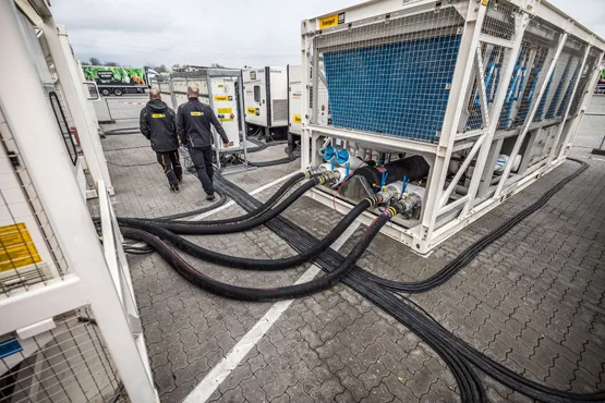 Energyst stellte innerhalb des vorgegebenen Zeitraums die drei Stromerzeuger, die beiden Stromverteiler, einen Dieseltank und die sieben Kaltwassersätze auf und verlegte rund 800 Meter Wasserschlauch und 720 Meter 240-mm2-Einzeladerkabel. Um die Wasserschläuche mit ihrem Durchmesser von 100 mm von der ebenerdigen temporären Anlage zur bestehenden Kühlung im Dachgeschoss führen zu können, hatte der Kunde die Montage eines Gerüsts an der Fassade organisiert. Für die Verlegung der Wasserschläuche in die Höhe nahm Energyst dann die Unterstützung von Zeppelin Rental in Anspruch. Die Mietstation Glinde lieferte mit kurzer Vorlaufzeit einen Teleskopstapler, mit dem Schläuche und Boxen gehoben werden konnten.