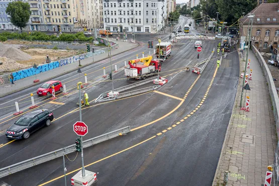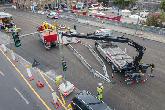 Bei der Montage der insgesamt 31 Signal- und acht Kabelmasten, die alle mit Betonfundamenten ausgestattet sind, verlegten Bauleiter Alexander Dzialek von Zeppelin Rental und sein Team vor Ort fast vier Kilometer Kabel. Für den Aufbau und die Ausrichtung der komplexen Lichtsignalanlagen lasen sie die Steuerungsprogramme auf die Steuerungsgeräte der einzelnen Lichtsignalanlagen ein. Anschließend wurde ein kompletter Testlauf durchgeführt und von der Abteilung VI – Verkehrsmanagement – der Senatsverwaltung für Umwelt, Verkehr und Klimaschutz abgenommen. In der Folge gingen die einzelnen Lichtsignalanlagen in ihren eigentlichen Betrieb. Zeitgleich wurde die Vollsperrung erst auf der Friedrichshainer und anschließend auf der Treptower Seite aufgelöst und der reguläre Verkehr konnte wieder fließen.