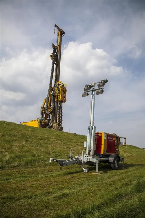 Seit März führt die BAUER Spezialtiefbau GmbH nun einen Teil der Deichsanierung durch und baut eine Innendichtung auf zwei Kilometern Länge mittels des vom Unternehmen patentierten Mixed-In-Place-Verfahrens ein. Dabei unterstützt die Riesaer Mietstation von Zeppelin Rental unter der Leitung von Sören Seifert mit zahlreichen Mietmaschinen und -geräten: Ein Radlader CAT 906H mit Ladegabel hilft beim Transport von Gerätschaften, der Kompressor XAS 97 versorgt unter anderem einen Hochdruckreiniger mit Druckluft. Zwei Flutlichtanlagen GEPX 18 LT beleuchten die nächtlichen Aktivitäten. „Denn wir arbeiten im Moment 24 Stunden an fünf Tagen die Woche“, so der zuständige Bauleiter Rene Kallenbach.