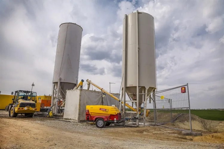 BAUER baut eine Innendichtung nach dem sogenannten Mixed-In-Place-Verfahren ein. Dabei werden vor Ort Bindemittel aus Silos in Mischern aufbereitet und in den Boden eingebracht. Eine Dreifachschnecke bricht den Grund auf, lagert ihn um mischt die Suspension mit dem Boden.