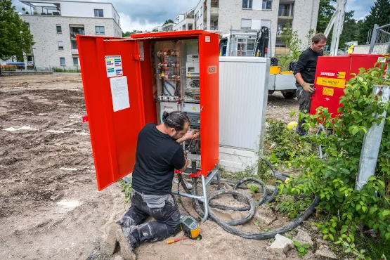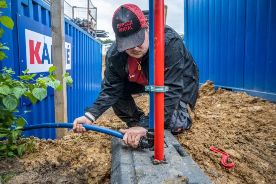 Denn bevor Wasser und Strom fließen, muss eine bedarfsgerechte Analyse erfolgen, welche eine reibungslose Versorgung während des gesamten Bauprozesses garantiert. Von der Montage bis zum Rückbau. Neben technischen Fragen – wo stehen die Krane und welchen Spitzenstrom benötigen sie? – gilt es auch individuelle Wünsche abzufragen. Beispielsweise den Standort und die Dimensionierung der Containerburg und weiterer energieintensiver Faktoren. „Sobald wir alle notwendigen Antworten haben, fährt ein Projektleiter raus und prüft die Gegebenheiten vor Ort. Insbesondere die Identifizierung einer geeigneten Energiequelle steht hierbei im Fokus“, so Wolfgang Müller, Senior Salesmanager bei Zeppelin Rental. „Im Zuge der Begehung haben wir festgestellt, dass der Straßenverteiler vor Ort defekt ist. Aber auch hier stehen wir im engen Austausch mit der zuständigen Behörde und kümmern uns um Ersatz“, betont Müller. Das gleiche gilt für das Bauwasser: Von der bedarfsgerechten Planung über die Installation bis hin zum Service und zur Abwasserentsorgung. So benötigen nicht nur fast alle Gewerke im Roh- und Ausbau Wasser, sondern auch Büro-, Unterkunfts- oder Sanitärcontainer müssen versorgt werden. „Und das alles in Trinkwasserqualität“, erläutert Florian Beller, Betriebsleiter Bauwasser bei Zeppelin Rental. „Wir verwenden nur Material, welches den Vorgaben des Deutschen Vereins des Gas- und Wasserfaches (DVGW) entspricht, und wir halten uns an die Norm DIN 1717. Diese stellt sicher, dass kein Nicht-Trinkwasser in unsere Installation gedrückt wird“, führt Beller weiter aus. Den Verbrauch rechnet der Kunde dann direkt mit dem örtlichen Wasserversorger ab. Dieser schafft innerhalb eines bauseits vorhandenen Übergabeschachts