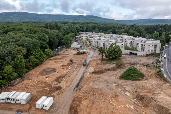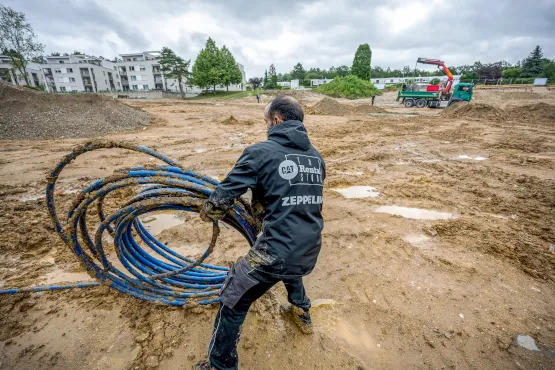 Noch lässt nur der angrenzende zweite Bauabschnitt erahnen, in welches Schmuckstück sich auch das dritte Baufeld bis Ende 2022 verwandeln wird. Denn das sogenannte Waldviertel besticht nicht nur durch die idyllische Lage, sondern vor allem durch das moderne und nachhaltige Konzept, welches auch die Optik des neuen Quartiers prägt. Neben einer Begrünung aller Dächer der Wohnhäuser und Tiefgaragen werden Ladestationen für Elektrofahrzeuge sowie Stationen für Carsharing-Anbieter und E-Lastenfahrräder in der Planung berücksichtigt. Neun Häuser mit insgesamt 97 Wohnungen sollen in anderthalb Jahren entstehen. Eine echte Herausforderung, so Arne Flauaus, Oberpolier bei Karrié Bau. „Die knapp bemessene Bauzeit ist definitiv die größte Herausforderung. Um diese einhalten zu können, ist ein strukturierter Bauablauf essenziell.“ Im Zuge der Ablaufplanung mittels „Lean Construction“ setzt der Oberpolier deswegen auch auf eine professionelle Baustelleneinrichtung. „Bei der Beauftragung von Baustrom sowie Bauwasser haben wir uns für Zeppelin Rental entschieden, da wir beide Leistungen aus einer Hand bekommen undhttps://www.zeppelin-rental.de/temporaere-infrastruktur/bauwasser so einen zentralen Ansprechpartner haben“, führt Flauaus weiter aus.