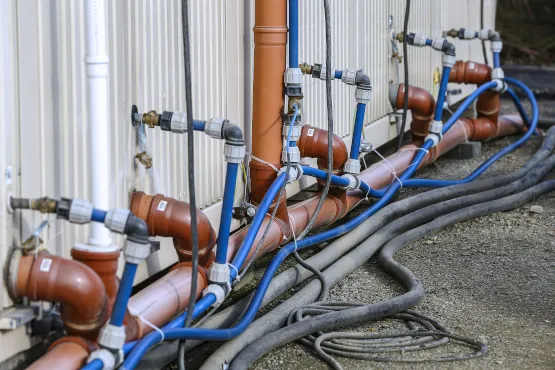 Insgesamt 1,6 Kilometer Rohrleitungen haben die Fachmonteure von Zeppelin Rental bereits für die ersten beiden Bauabschnitte in Laatzen verlegt. Zwölf WC-, Dusch- und Küchencontainer sind mit Wasser- und Abwasseranschlüssen versehen. Vor ihrer Inbetriebnahme werden die Leitungen gespült und die Anschlüsse auf ihre Dichtheit geprüft. 14 Wasserverteiler entlang des Rohrleitsystems bieten Entnahmestellen über die verschiedenen Baufelder verteilt.
