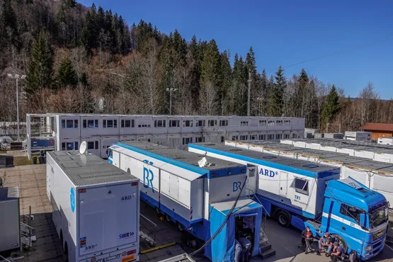 Denn der Veranstalter benötigte 29 Containeranlagen, die sich aus insgesamt fast 500 Raumsystemen zusammensetzten. Einen großen Teil machte das so genannte International Broadcast Center, kurz IBC, aus, für dessen Errichtung allein 200 Einheiten gebraucht wurden. Dort schuf Zeppelin Rental auf zwei Etagen Arbeitsräume für hunderte Medienvertreter*innen und TV-Produktionen, die die Wettkämpfe an der Langlaufloipe, am -stadion und im Bereich der Skisprungschanzen übertrugen und begleiteten. Auch die Teams und Ausrüster der Athletinnen und Athleten benötigten zusätzlich zu ihren mobilen Wachs-Trucks zahlreiche Raumsysteme. Insgesamt fast 300 Einheiten aufgeteilt auf mehrere Anlagen dienten als Garderoben, Wachs- und Ruheräume. Dazu kamen Sanitärbereiche, Container für medizinische Untersuchungen, für den Shuttle-Service, den Sicherheitsdienst, für die Veranstalter und Organisatoren sowie die Polizei.