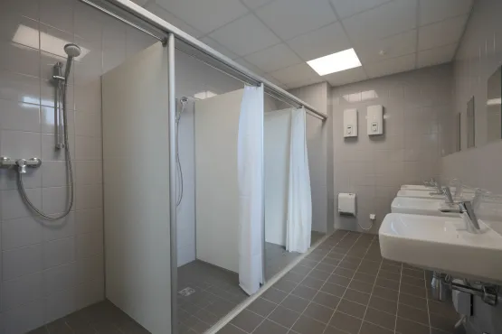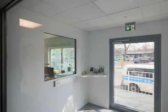Nachdem alle Module vor Ort zusammengeschweißt wurden, startete der Innenausbau nach den individuellen Kundenanforderungen. Das Innere der temporären Polizeistation überzeugt durch hohe Qualität und Komfort. So sind Treppenhäuser, Sanitär- und Duschbereiche sowie das Modul für die Polizeihunde gefliest. Der Bereich für den kurzfristigen Aufenthalt der vierbeinigen Kollegen verfügt zudem über eine Tageslichtkuppel und Infrarotheizungen. Die Bodenbeläge in Fluren und Büroräumen bestehen aus robustem homogenen PVC. Darüber hinaus wurde eine schallabsorbierende Decke eingezogen, um die Raumakustik zu verbessern und so eine optimale