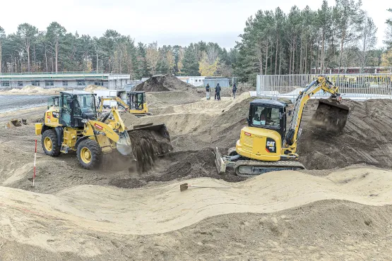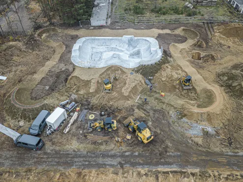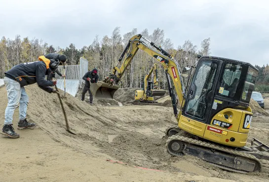 Das Besondere der Action-Sportanlage ist ihre Architektur: Der Asphalt-Pumptrack umrundet eine 450 m² große Beton-Skatebowl. Das bedeutet, es entsteht eine vielseitige Multisportanlage, zugänglich für unterschiedliche Nutzergruppen. Im inneren Umfeld ist die Bowl in Spritzbetonbauweise gestaltet, ein in den Boden eingelassenes Becken mit Rampen, sogenannten Transitions, an den Rändern. Diese Bowls sind tatsächlich von trockengelegten Pools inspiriert, die beispielsweise in Kalifornien von Skatern zweckentfremdet wurden. Um dieses komplexe Konstrukt aus Wellen, Kurven und Vertiefungen zu bauen, holte sich die Firma Schneestern Unterstützung von Zeppelin Rental in Form von Baumaschinen. So wurden zwei Radlader, ein CAT 918M und ein CAT 906H, zwei Minibagger 303.5E CR, ein Fünf-Tonnen-Bagger CAT 305E CR sowie zwei Vibrationsplatten CR5 auf die Baustelle in Eberswalde-Finow geliefert. Darüber hinaus kümmerte sich die Mietstation Oranienburg, die das Gebiet im Norden Berlins betreut, um die adäquate Baustellensicherung durch Absperrzäune. „Bei nahezu jedem unserer Projekte holen wir unseren Partner Zeppelin Rental mit ins Boot. Die Liefertreue, egal wo sich unsere Baustellen in Deutschland und Österreich befinden, und der Service sind einfach unschlagbar, da ist immer ein Ansprechpartner erreichbar. Wir pflegen schon seit Jahren eine vertrauensvolle Geschäftsbeziehung“, betont Joachim Malek, Projektmanager Bike & Skate bei Schneestern GmbH.