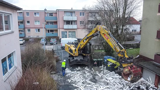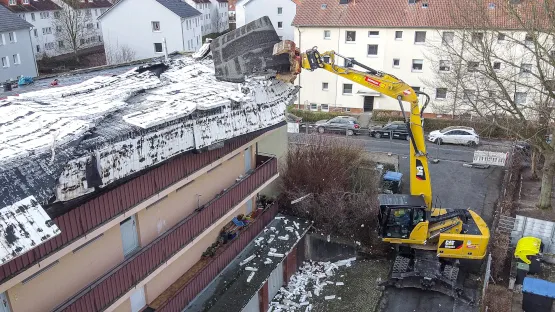 ihnen durchführen, wie Stephan Mau bestätigt: „Bei diesem Projekt wurde der Umschlagbagger zweckentfremdet. Es ging um keinen Abbruch, sondern den gezielten Rückbau eines bewohnten Gebäudes. Nach kurzer Einweisung konnte ich das Material kleinteilig abtragen“, so Mau. Hierfür stand er im ständigen Funkkontakt mit Fachkräften auf dem Dach, die Dachpappe und Styropor zerteilten. Wäre die Pappe in einem Schwung heruntergezogen worden, so hätte man eine Beschädigung der Balkone und Garagen riskiert. Einen Tag dauerte der fachgerechte Abtrag des Daches, einen Weiteren das Sortieren und Verladen der Bruchstücke. Mit dem Verlauf des Projektes ist der Geschäftsführer zufrieden: „Der Umschlagbagger war just-in-time in weniger als 24 Stunden vor Ort. Das wäre mit einem anderen Vermieter so wahrscheinlich nicht möglich gewesen“, betont er. Ausreichend Publikum für den Einsatz war ebenfalls vor Ort: „Die Kinder haben an den Scheiben geklebt und waren begeistert. Da haben wir bestimmt den ein oder anderen künftigen Caterpillar-Fahrer rekrutiert“, schmunzelt Stephan Mau.