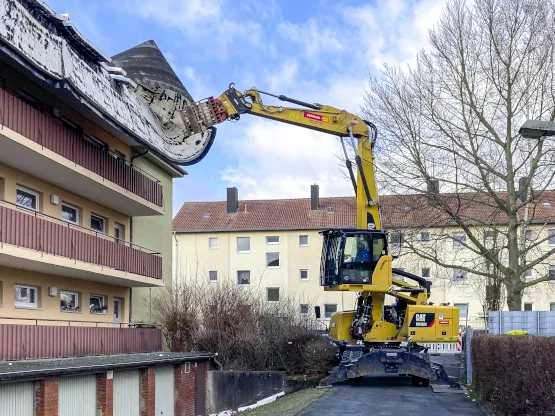 Eine klassische Einrüstung des Gebäudes kam aufgrund von potenziell herabstürzenden Teilen nicht infrage. Und auch die örtlichen Gegebenheiten waren eine Herausforderung: „Das richtige Gerät musste problemlos die Dachkante in elf Meter Höhe erreichen. Außerdem war der Platz vor Ort knapp und wir hatten einen begrenzten Drehradius. Ich habe dann Arne Neumann von Zeppelin Baumaschinen um Rat gefragt“, führt Stephan Mau weiter aus. Erst vor Kurzem hatte das Unternehmen einen Radlader CAT 914 von Neumann erworben. Der Vertriebsrepräsentant stellte den Kontakt zu den Kollegen von Zeppelin Rental her. „Wir haben dem Kunden den Umschlagbagger CAT MH3024 ULM empfohlen. Dieser erreicht eine maximale Arbeitshöhe von 14 Metern und ist trotzdem kompakt. Einmal auf einen Tieflader verladen, kann er zum Einsatzort verbracht werden. Vorteil der Maschine ist, dass trotz der hohen Auslage kein Sondertransport oder die Demontage des Auslegers nötig ist. So können wir schnell reagieren“, erklärt Mateusz Pionke, Leiter der Mietstation Hannover-Laatzen.
