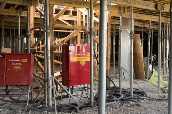 Bereits im Vorfeld nahm Elektromeister Günther Thalhammer von Zeppelin Rental in Unterschleißheim Verbindung mit dem örtlichen Grundversorger auf und koordinierte den Anschluss an das öffentliche Netz. Für die richtige Dimensionierung der Baustrominfrastruktur wurde die Leistungsaufnahme aller Verbraucher ermittelt, Kabelquerschnitte und Leitungslängen wurden berechnet und ein umfassendes, auf die Baustelle angepasstes Konzept zur Baustromversorgung erstellt. Kurz vor Beginn der Rohbauarbeiten im Mai 2018 richteten die Elektriker von Zeppelin Rental schließlich die Zuleitung zur Baustelle ein und nahmen die ersten Stromverteiler auf dem Baufeld in Betrieb.