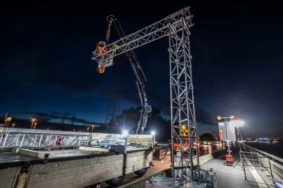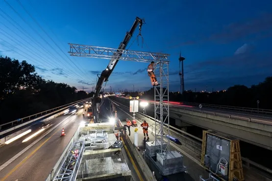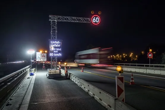 Für die Stromversorgung der Verkehrsbeeinflussungsanlage berechnete das Elektrofachpersonal von Zeppelin Rental den geeigneten Kabelquerschnitt und verlegte eine ein Kilometer lange Leitung, die die Anlage mit der vorhandenen Baustromversorgung verbindet. Neben der Konzeption und der Montage der Signalanlage kümmerte sich Zeppelin Rental auch um die Umsetzung des Verkehrszeichenplans. In insgesamt elf Nachtschichten stellte das Team um Bauleiter Sven Suchodolski die Beschilderung her, reduzierte die Breite der Fahrstreifen in beiden Fahrtrichtungen mittels Markierungsfolie und montierte transportable Schutzeinrichtungen, die das Baufeld von der Fahrbahn trennen. Eine eigens durch Zeppelin Rental produzierte Hinweistafel informiert Verkehrsteilnehmer zudem über die Eckdaten der Baumaßnahme.