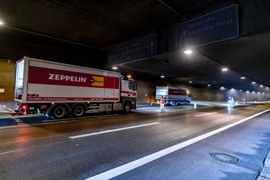 Nach dem Abschluss der Planungen und Abstimmungen mit allen Beteiligten startete Zeppelin Rental Ende März vorbereitend mit der Ausbringung der nötigen Beschilderung, die auch im Kompetenz-Center hergestellte Hinweistafeln sowie LED-Wechselverkehrszeichen umfasste. Es folgten in beiden Tunnelröhren und -bereichen die Vormarkierung sowie die Verlegung von über 20 Kilometern Gelbmarkierungsfolie, die Aufstellung von 260 Metern temporärer Schutzeinrichtung der Aufhaltestufe H1/ Wirkungsbereich W4 und knapp sechs Kilometern der Aufhaltestufe T3/Wirkungsbereich W2, die Platzierung von 154 Warnbaken in den Verschwenkungsbereichen sowie schließlich die Inbetriebnahme der temporären Verkehrsführung am Ostersonntag. „Der Engelbergtunnel verbindet die beiden Autobahnen A 8 und A 81 und stellt einen wichtigen transeuropäischen Verkehrsknotenpunkt dar“, erklärt Bauleiter Alfred Diemer von Zeppelin Rental. „Unsere Arbeiten haben wir deshalb entsprechend der Vorgaben sehr eng getaktet, sortenrein und ausschließlich nachts durchgeführt.“