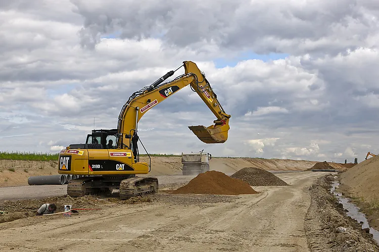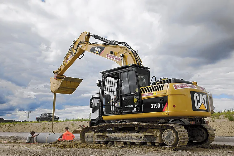 Als Abschluss des Erdbauwerks wird ein seitlich geneigtes Planum hergestellt, das die Entwässerung sicherstellt. Denn: Fällt die Fahrbahn nicht zu den Seiten hin ab, kann sich bei Regen Wasser auf ihrer Oberfläche sammeln. Die Gefahr des Aquaplanings sowie – bei Temperaturen unter dem Gefrierpunkt – der Bildung einer Eisfläche steigt. Außerdem muss ein Einsickern von Wasser in die Straßenoberfläche und somit eine Zerstörung der Konstruktion verhindert werden. In den Richtlinien für die Anlage von Straßen (RAS) ist die Entwässerung eigens geregelt. Im Fall der B 169 wird das Wasser in einer Entwässerungsmulde und in Sammelkanälen über Straßenabläufe aufgefangen und in neu errichtete Regenrückhaltebecken abgeleitet – die Rohrverlegung erfolgte mit Hilfe des Kettenbaggers 319D von Caterpillar aus der Flotte von Zeppelin Rental. Außerdem wurde mit den Baggern die Frostschutzschicht eingebaut. Sie sorgt dafür, dass am Straßenaufbau keine Schäden durch Kälte und Frost entstehen.
