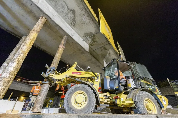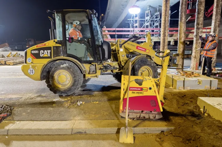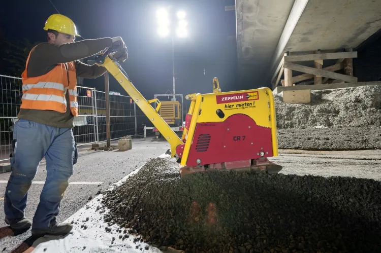 Das Mietequipment wurde unter anderem für Arbeiten eingesetzt, die der Vorbereitung des Brückenabtrags dienten. So musste die Firma Nagelschneider, Spezialist für Ingenieurbau, Sanierung und Abbruch, die Straße unter dem Bauwerk vor herabfallenden Trümmern schützen. Dazu wurde ein Fallbett aus Schotter hergestellt, das ein Arbeiter mit einer Rüttelplatte CR7 verdichtete. Zudem musste das Bauwerk gestützt werden, um die Last der Abbruchbagger zu tragen. Dazu setzte das Unternehmen Stahlstützen und Holzstämme ein. Um sie an Ort und Stelle zu transportieren, wurden ein Kran sowie ein Radlader von Zeppelin Rental benötigt. Die optimale Platzierung erfolgte in der Höhe von zwei gemieteten Arbeitsbühnen aus. Die Dienste des Bobcat S70 wurden auf der Brücke in Anspruch genommen, wo mit dem Kompaktlader Transportarbeiten vorgenommen wurden. Insgesamt 1.100 m3 Beton und 120 Tonnen Stahl trug Nagelschneider ab.