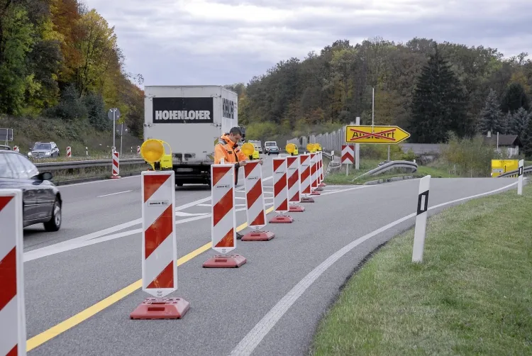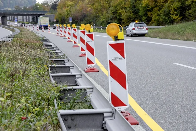 Um die Bauzeit möglichst kurz zu halten und allzu starke Verkehrsbehinderungen zu vermeiden, sollten die Asphaltfräsen in beide Fahrtrichtungen gleichzeitig arbeiten können. Zeppelin Rental verengte dazu in kürzester Zeit die beiden Fahrspuren pro Richtung auf jeweils eine. Insgesamt 1386 Leitbaken sowie Fußplatten mit einem Gesamtgewicht von 28 Tonnen kamen dabei zum Einsatz.