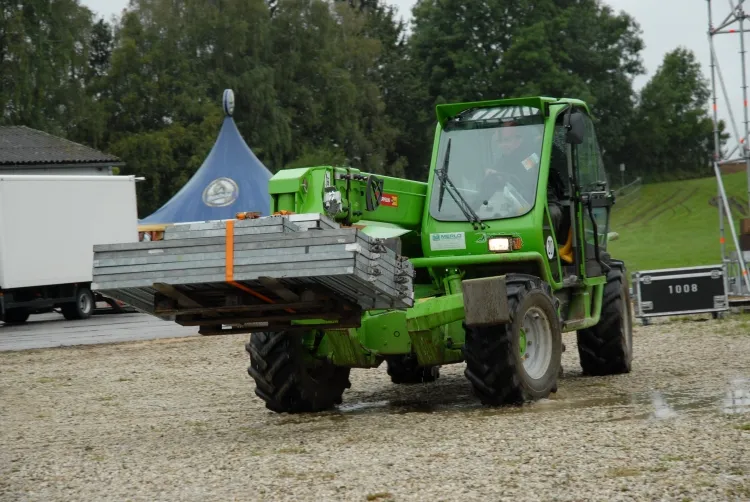 Für die Organisatoren und Künstler – in diesem Jahr unterhielten unter anderem die österreichische Sängerin Christina Stürmer, Clean Bandit und Donikkl das Publikum – wird ein eigener Backstagebereich aus Raumsystemen und Sanitärcontainern von Zeppelin Rental geschaffen. Insgesamt sechs gemietete Hybrid-Flutlichtanlagen leuchten bei der Veranstaltung und beim Auf- und Abbau die Wege und das Gelände aus, mit Teleskopstaplern verschiedener Größen werden LKW abgeladen und die Bühnentechnik transportiert. Und das bedeutet viel Arbeit. Denn rund 70 40- und 12-Tonner rollten Mitte September nach Altdorf, um Technik, Stahlaufbauten für die Bühne, Getränke und vieles mehr zum Veranstaltungsgelände, der Alten Ziegelei, zu bringen.
